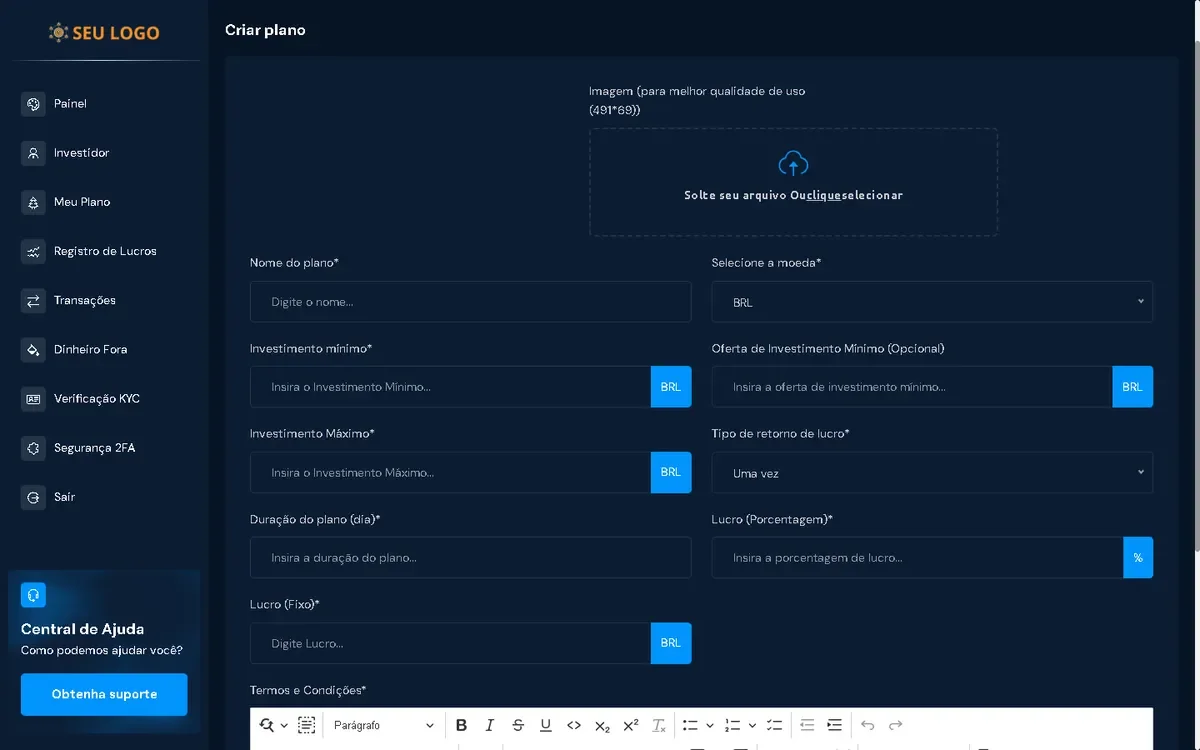 Gerenciamento de planos de investimento: permite que as empresas editem seus planos existentes, alterando tipo, duração e retorno.
