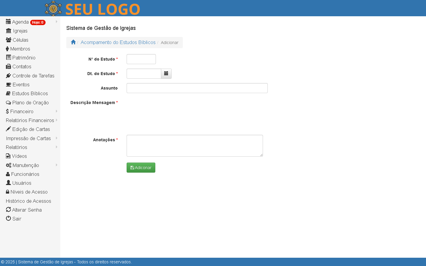 Com uma interface simples e prática, o sistema oferece recursos essenciais para manter o controle das atividades e fortalecer a gestão interna da instituição.