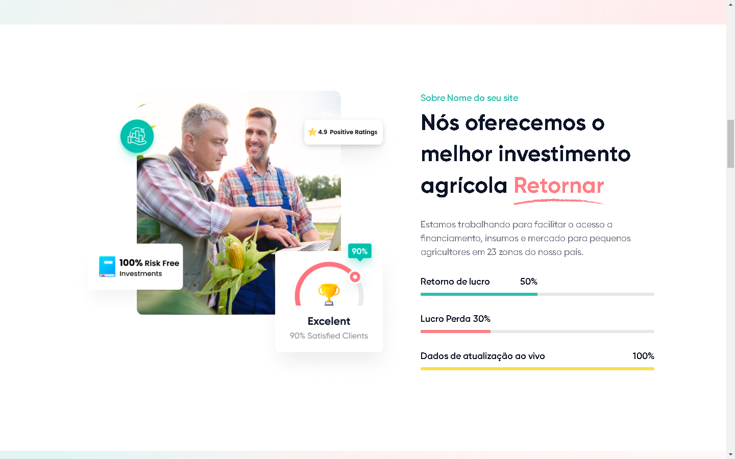 Os usuários podem investir em uma seleção de projetos agrícolas e diversificar seus investimentos. O sistema permite acompanhar o progresso em tempo real.