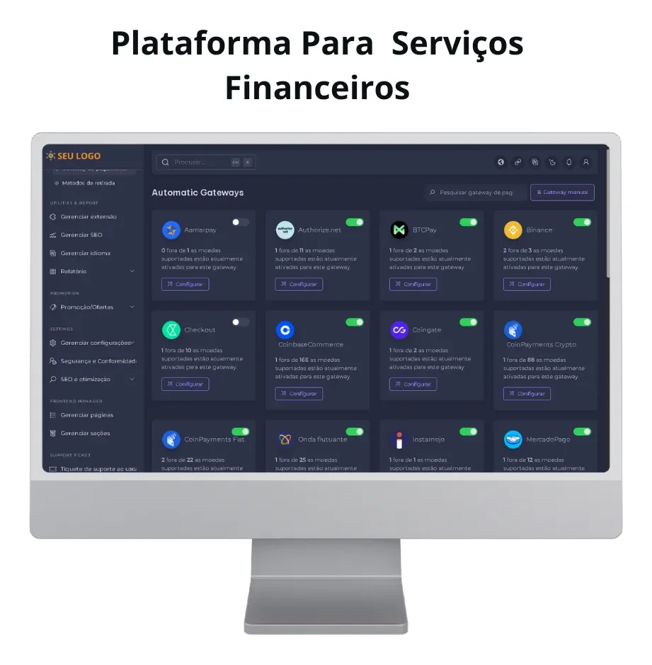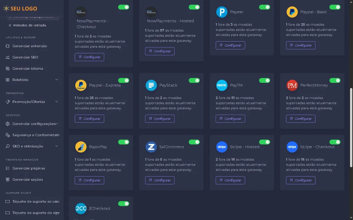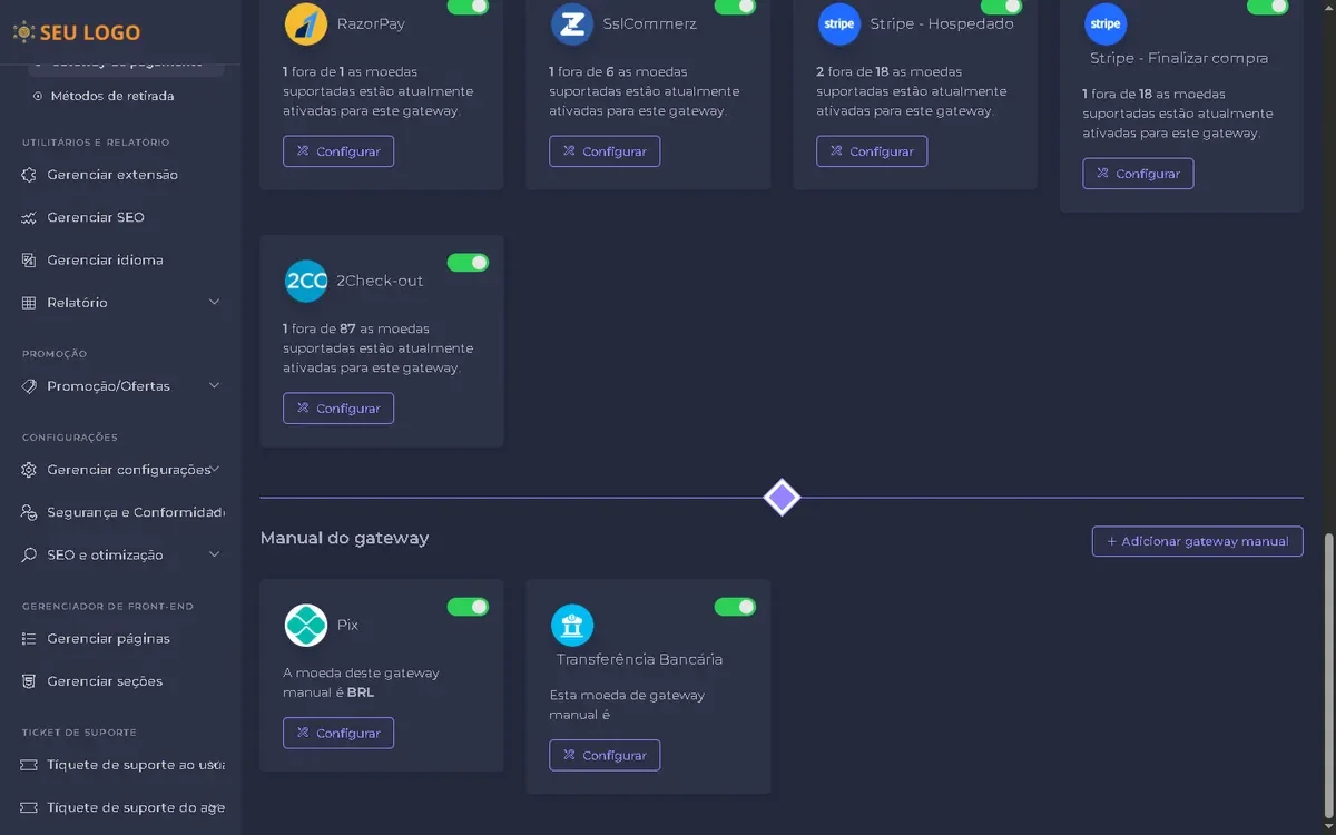 – Configuração de gateways de pagamento.