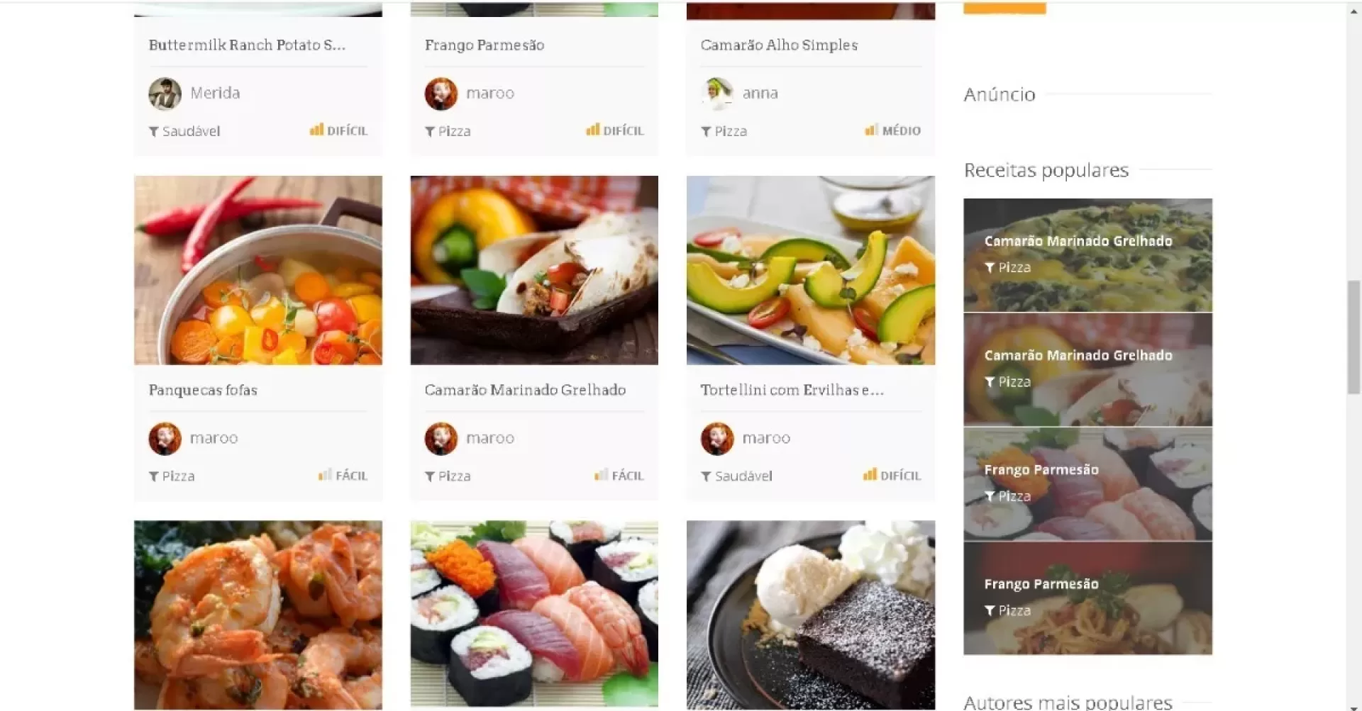 A página única para a categoria de receitas incluía sua categoria e pesquisa avançada.